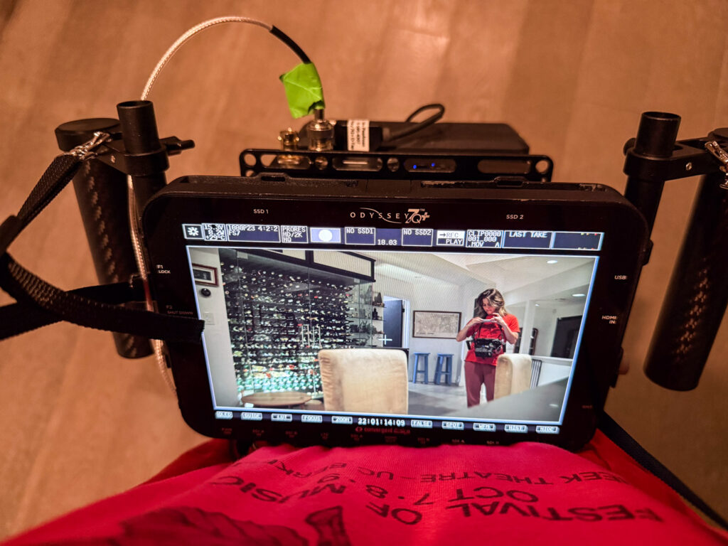 The first production day was primarily unscripted. We wanted to allow the day to unfold naturally, with Kat carefully adjusting her performance to create the range of reactions and emotions needed to tell the story. Our wonderful producer, Emily Maya Mills, who is also an accomplished director, kept a sharp eye on things from a distance on a wireless monitor.