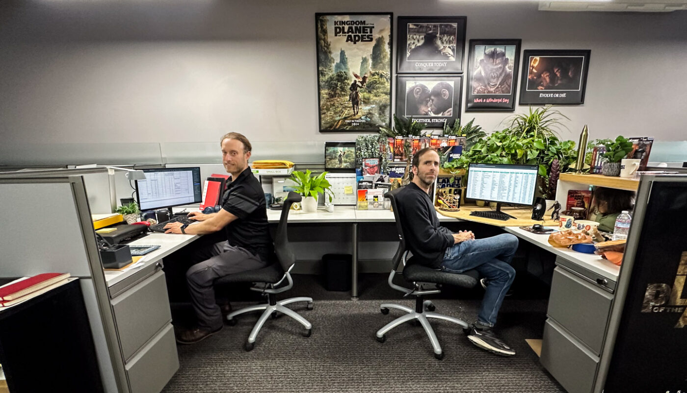 Steven Tolber and his team did a wonderful job populating the bare office with amazing Planet of the Apes memorabilia and greens to differentiate between our two characters. I love how the posters form a vertical line between their workspace (one that isn’t equitably split).